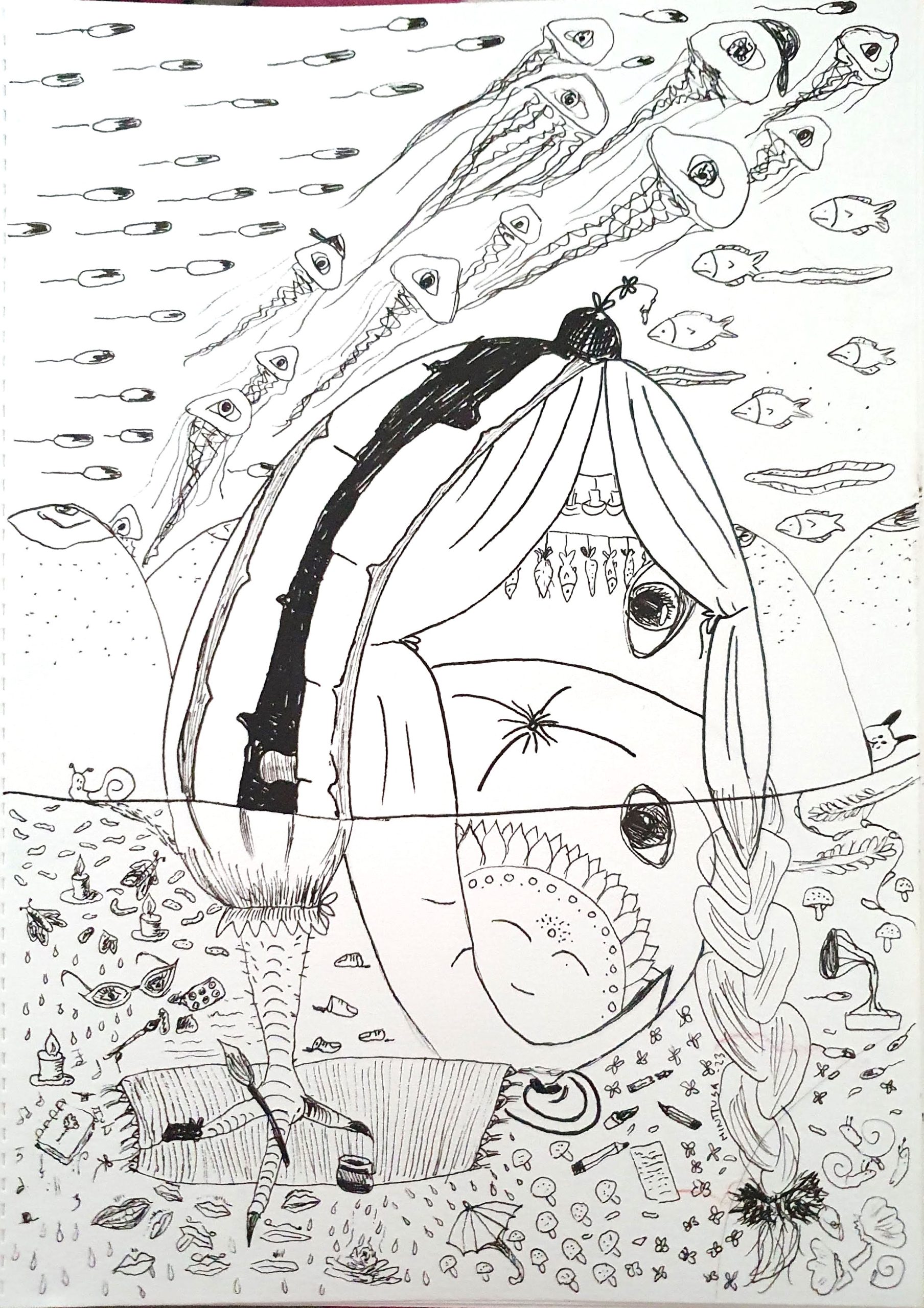 Fish and other toughts 1. , A5, 2023, indian inkMoving theatre, indian ink on paper, a5, 2023