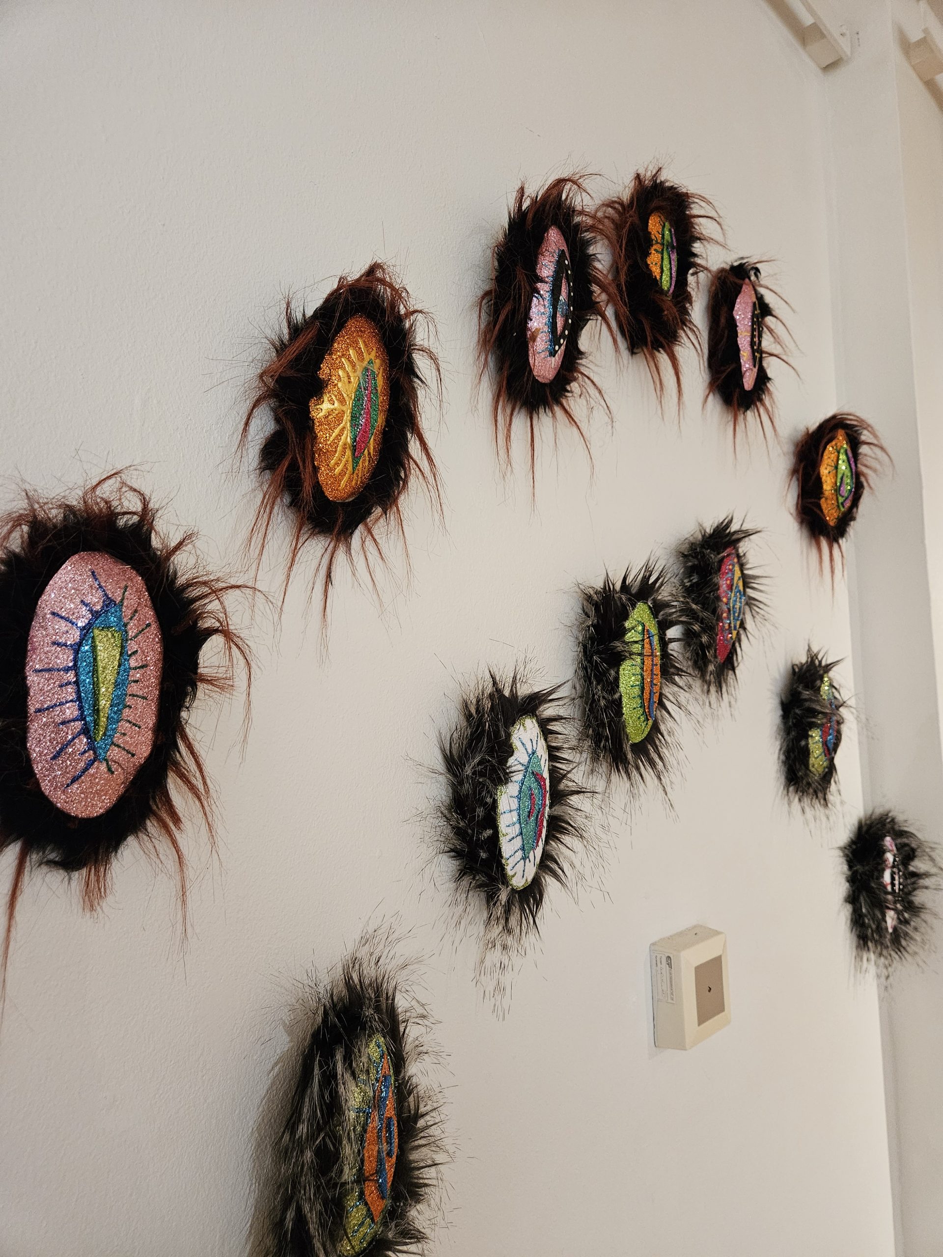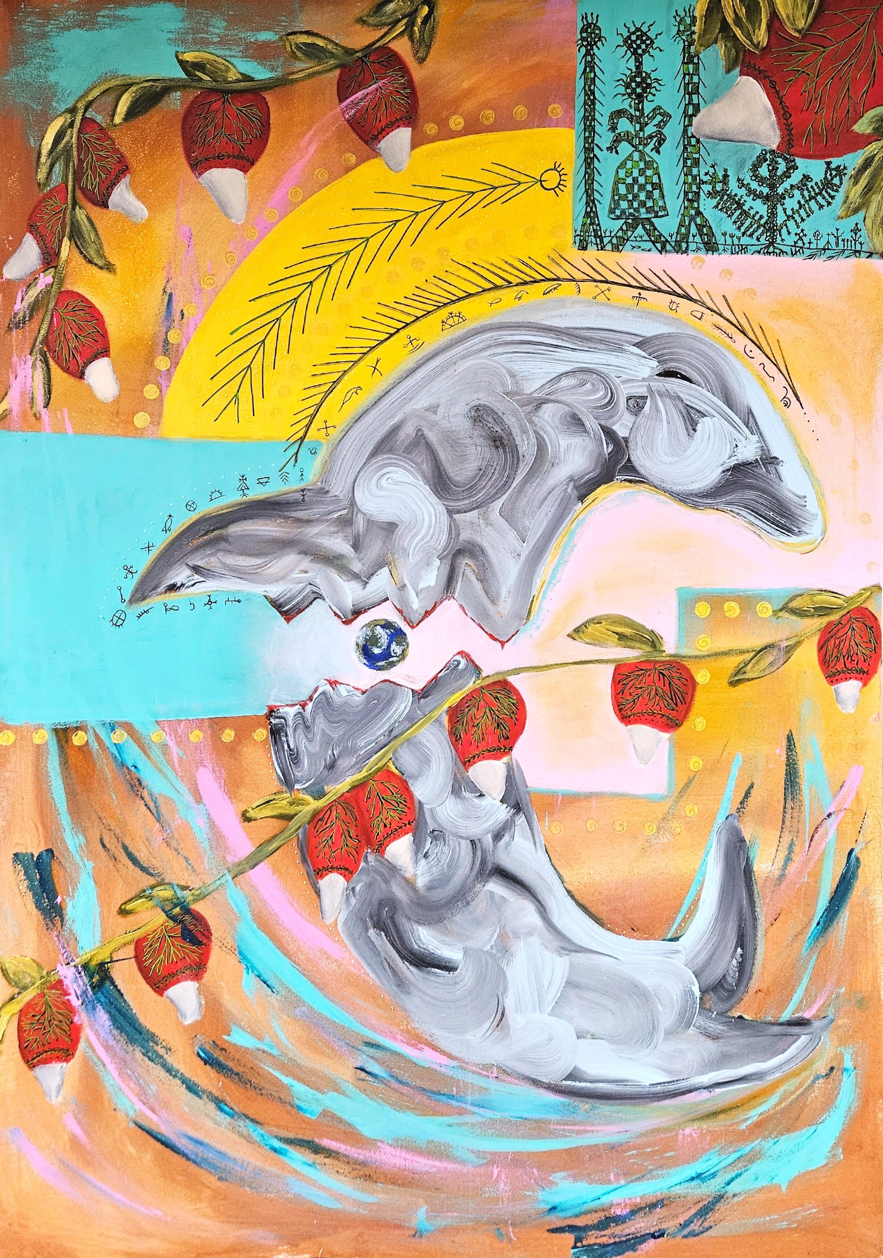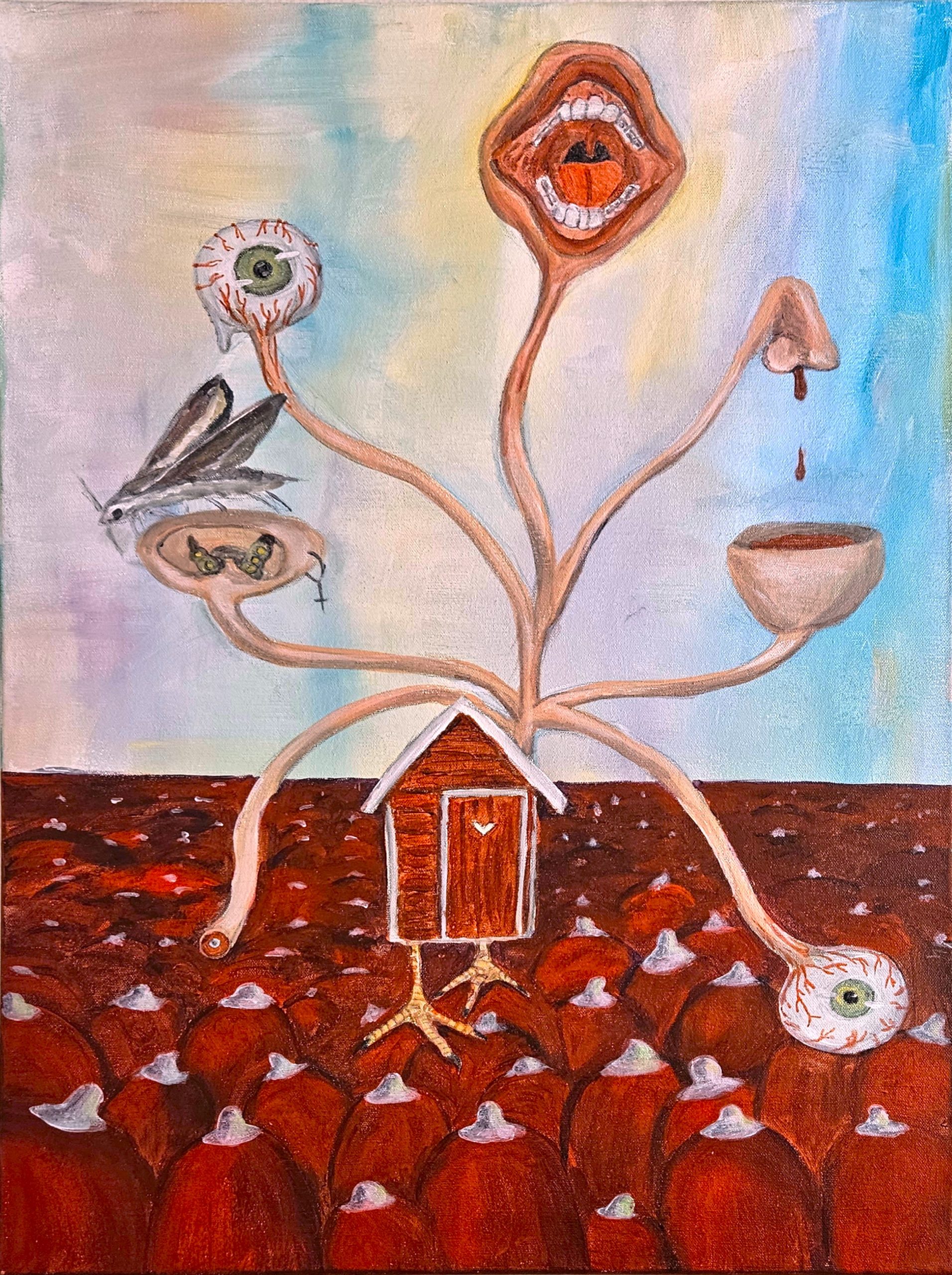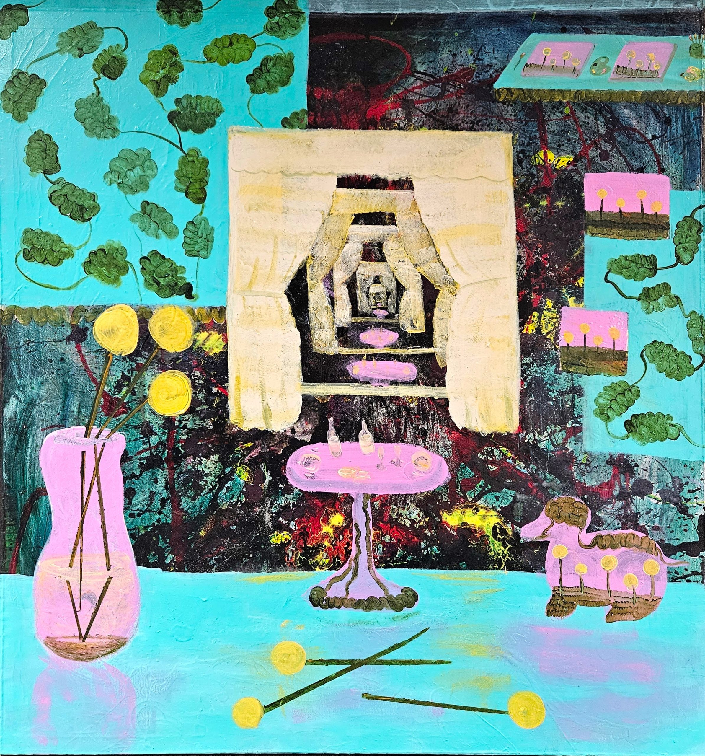 The pond where unborns sleep, acrylic on canvas, 180x140cm, 2024Parallell realities, acrylic on canvas, glitter ,180x130cm, 2024Symbiosis VI recycled materials acrylic 2022Symbiosis V recycled materials, acrylic 2022Symbiosis IV recycled materials, acrylic 2022Mother earth´s onions, Window exhibition, Art hall Häme, Finland 2024 Tea Time, acrylic on canvas, 90x60cm, 2023Sampo, acrylic on canvas, 1000x100cm, 2023Tea Time 2., acrylic on canvas, 90x60cm 2023Kin of the forest, recycled materials, 2022Kin of the forest, recycled materials,2022The carrot of nine diseases, acrylic on canvas, 130x180cm, 2024Snail hail and a milking male acrylic, dry pastel and glitter on canvas, 130x160cm, 2023