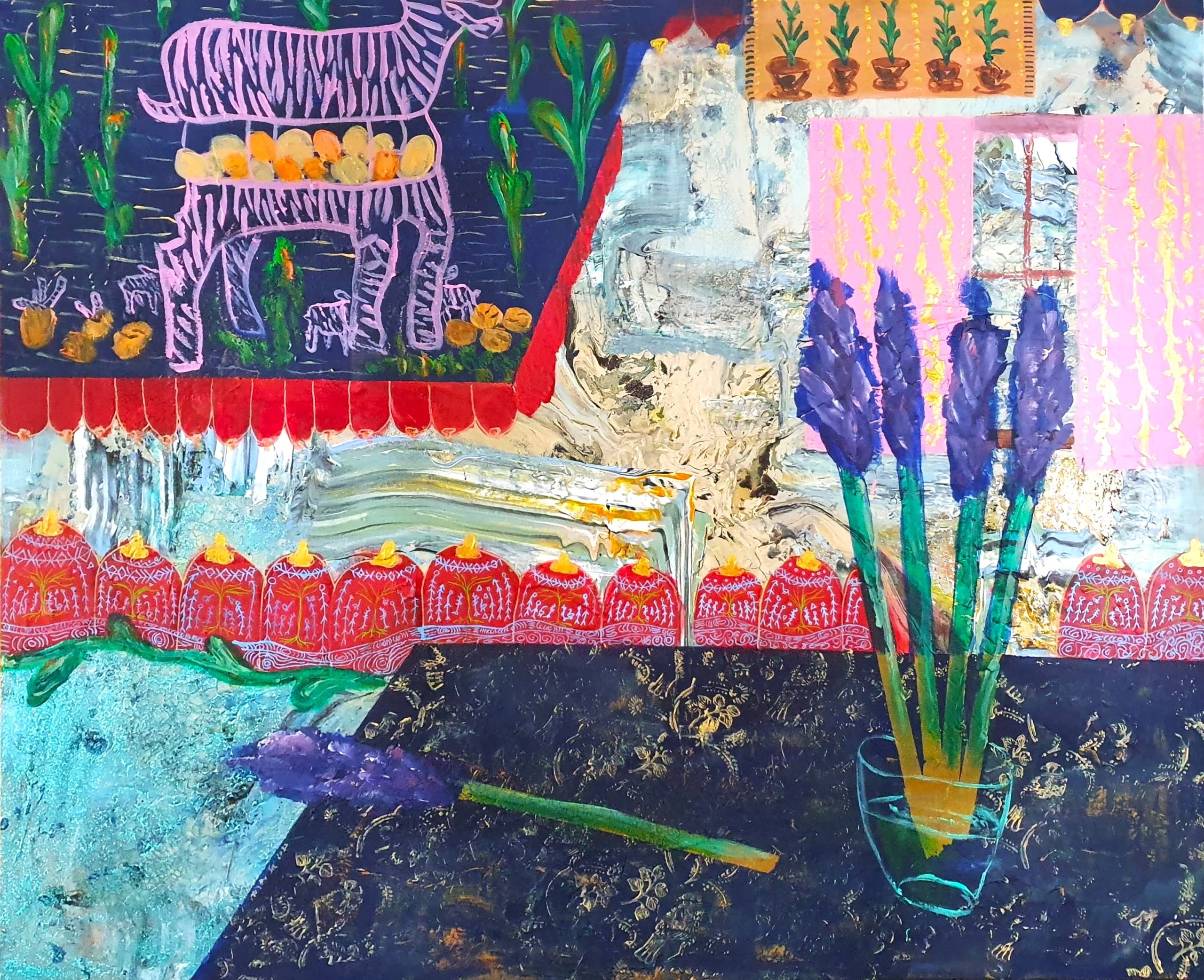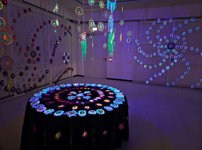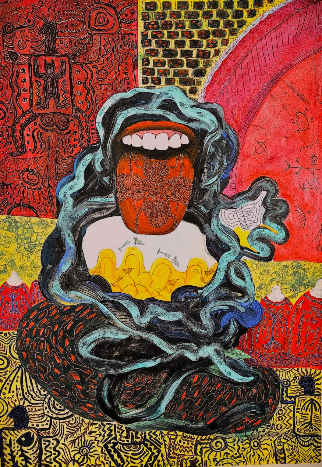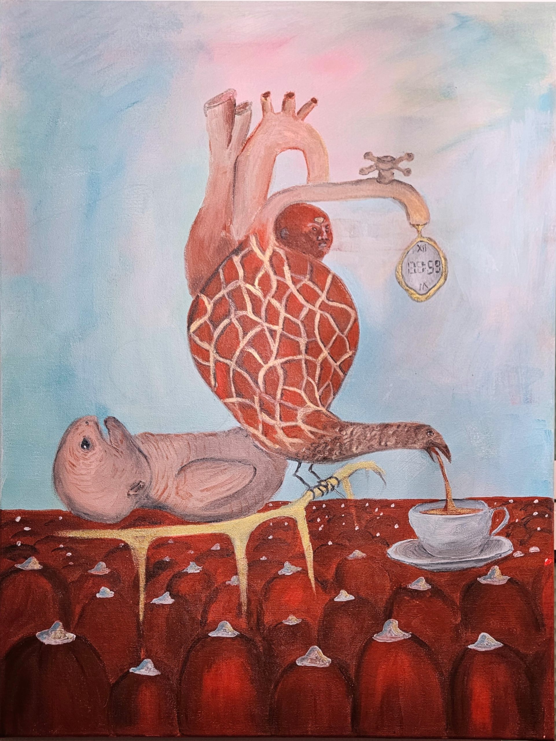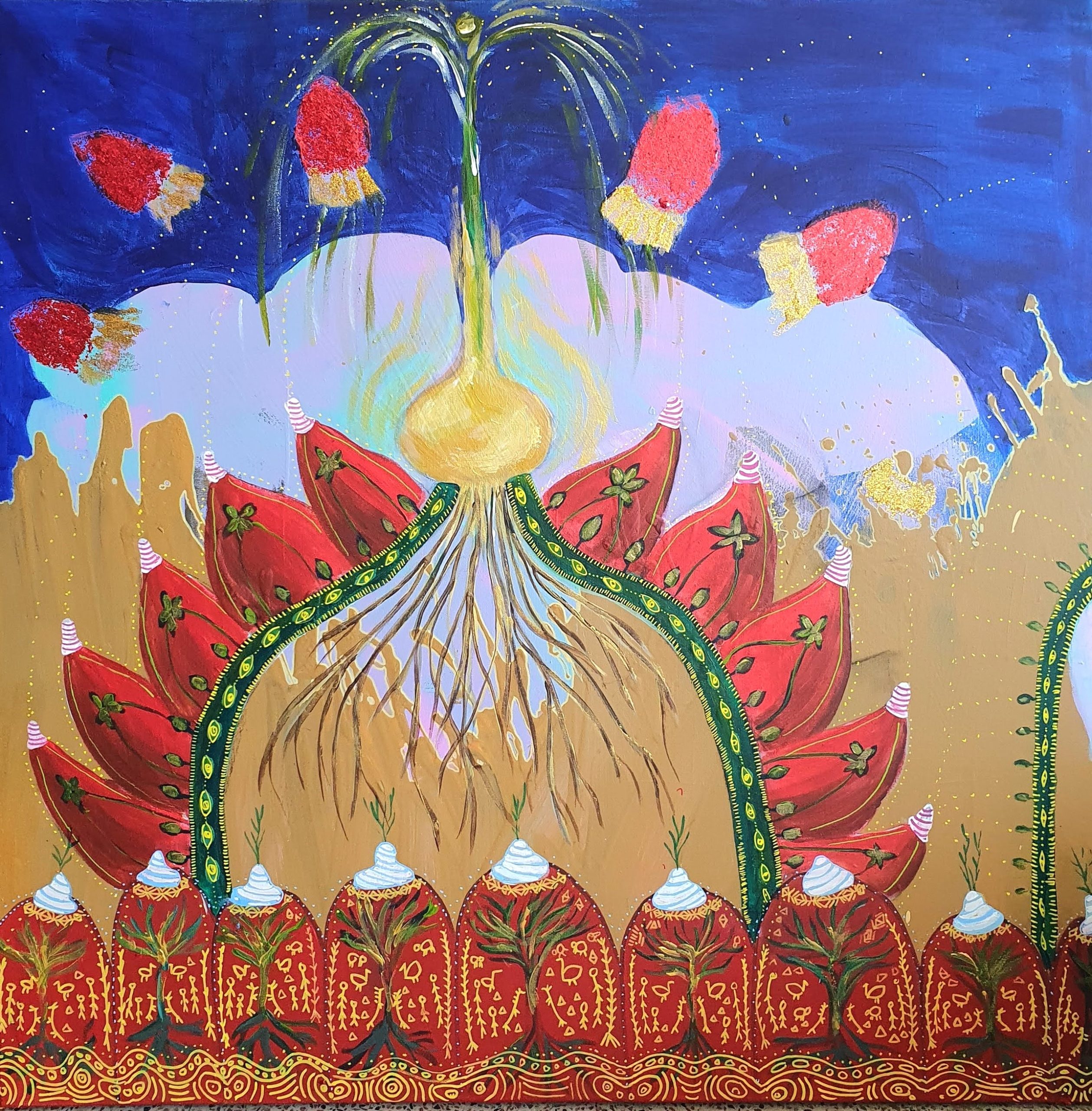 The pond where unborns sleep, acrylic on canvas, 180x140cm, 2024Parallell realities, acrylic on canvas, glitter ,180x130cm, 2024Symbiosis VI recycled materials acrylic 2022Symbiosis V recycled materials, acrylic 2022Symbiosis IV recycled materials, acrylic 2022Mother earth´s onions, Window exhibition, Art hall Häme, Finland 2024 Tea Time, acrylic on canvas, 90x60cm, 2023Sampo, acrylic on canvas, 1000x100cm, 2023Tea Time 2., acrylic on canvas, 90x60cm 2023Kin of the forest, recycled materials, 2022Kin of the forest, recycled materials,2022The carrot of nine diseases, acrylic on canvas, 130x180cm, 2024Snail hail and a milking male acrylic, dry pastel and glitter on canvas, 130x160cm, 2023